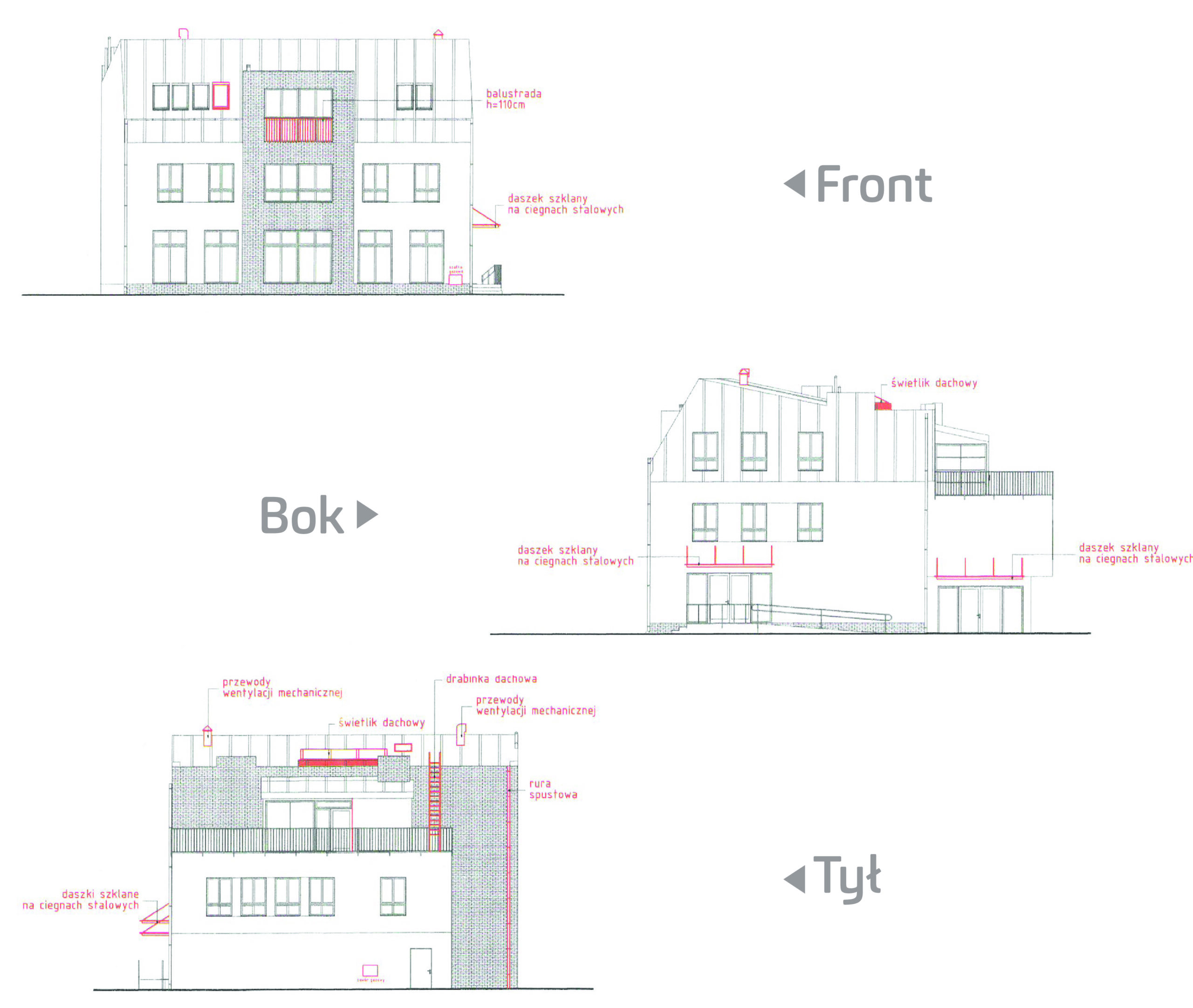 Rzuty budynku z boku, frontu oraz od tyłu