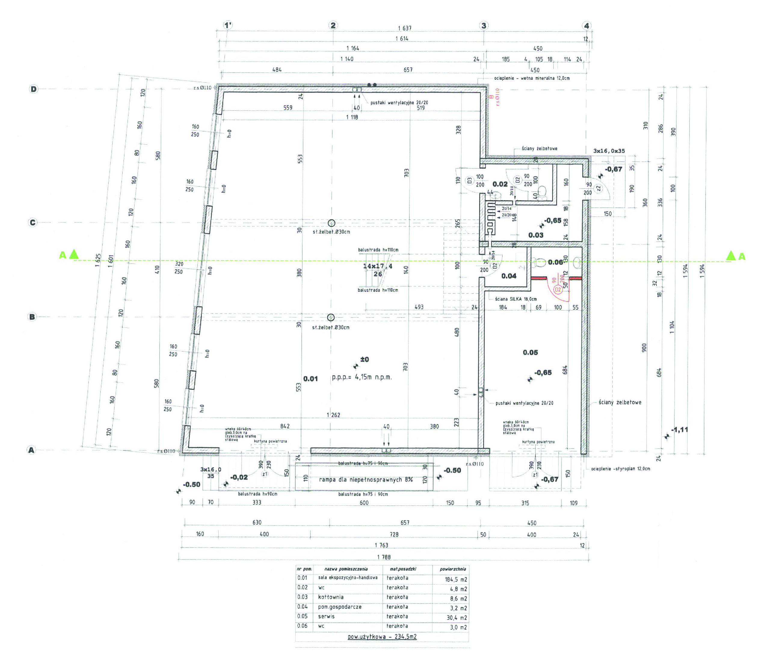 Na parterze budynku znajduje się duże pomieszczenie (184,5 m2), króte może być wykorzystywane jako pokazowe (sala sprzedażowa), wystawowe oraz miejsca na spotkania firmowe lub eventy. Dodatkowo można je wykorzystać w konwencji open space dla biura. Na parterze znajduje się również toaleta oraz pomieszczenie techniczne